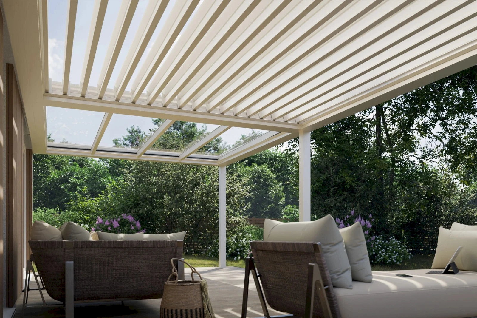 - Presklená strecha chráni terasu pred dažďom a zároveň prepúšťa dostatok denného svetla.