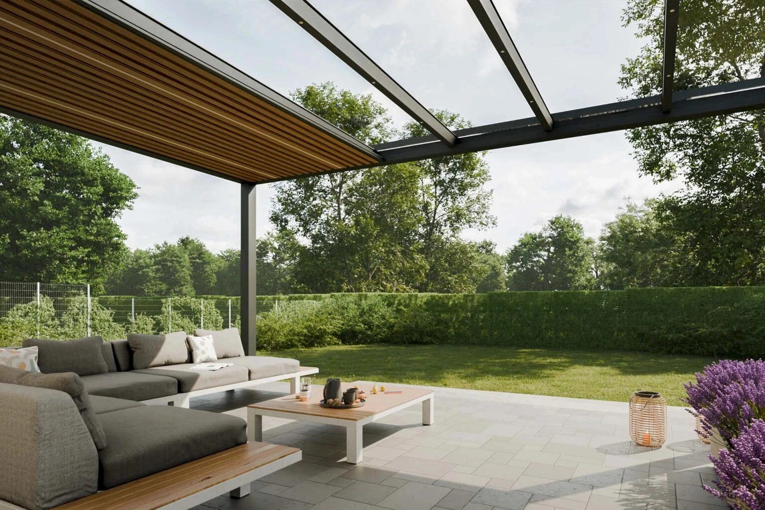 - Presklená strecha chráni terasu pred dažďom a zároveň prepúšťa dostatok denného svetla.