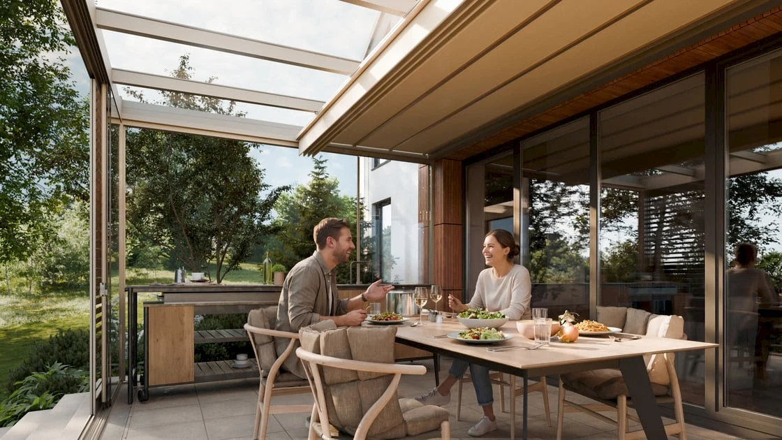 - Ak chcete chrániť seba, svoj nábytok a doplnky, oplatí sa zvoliť bočné rolety, panely Shutters posuvné, alebo fixné presklenie.