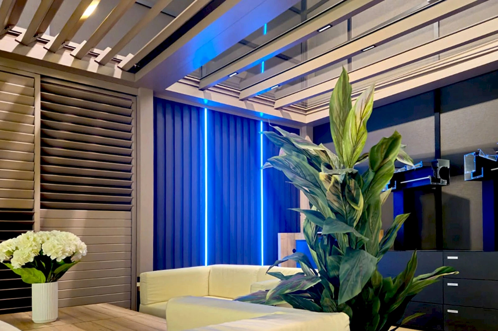 - Potom je spodok strechy vyrobený z estetickej látky s nosníkmi, do ktorých je možné namontovať LED osvetlenie.