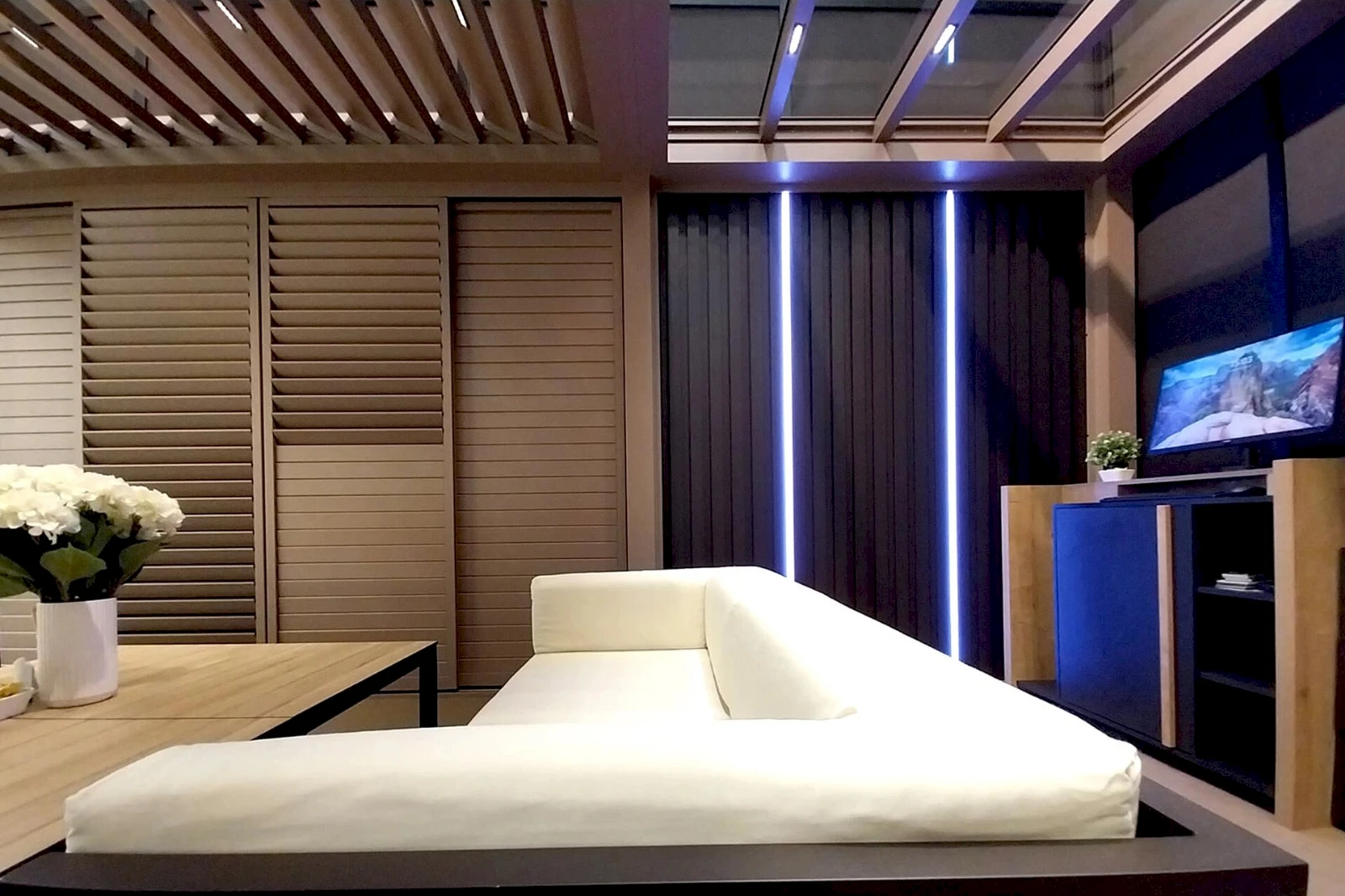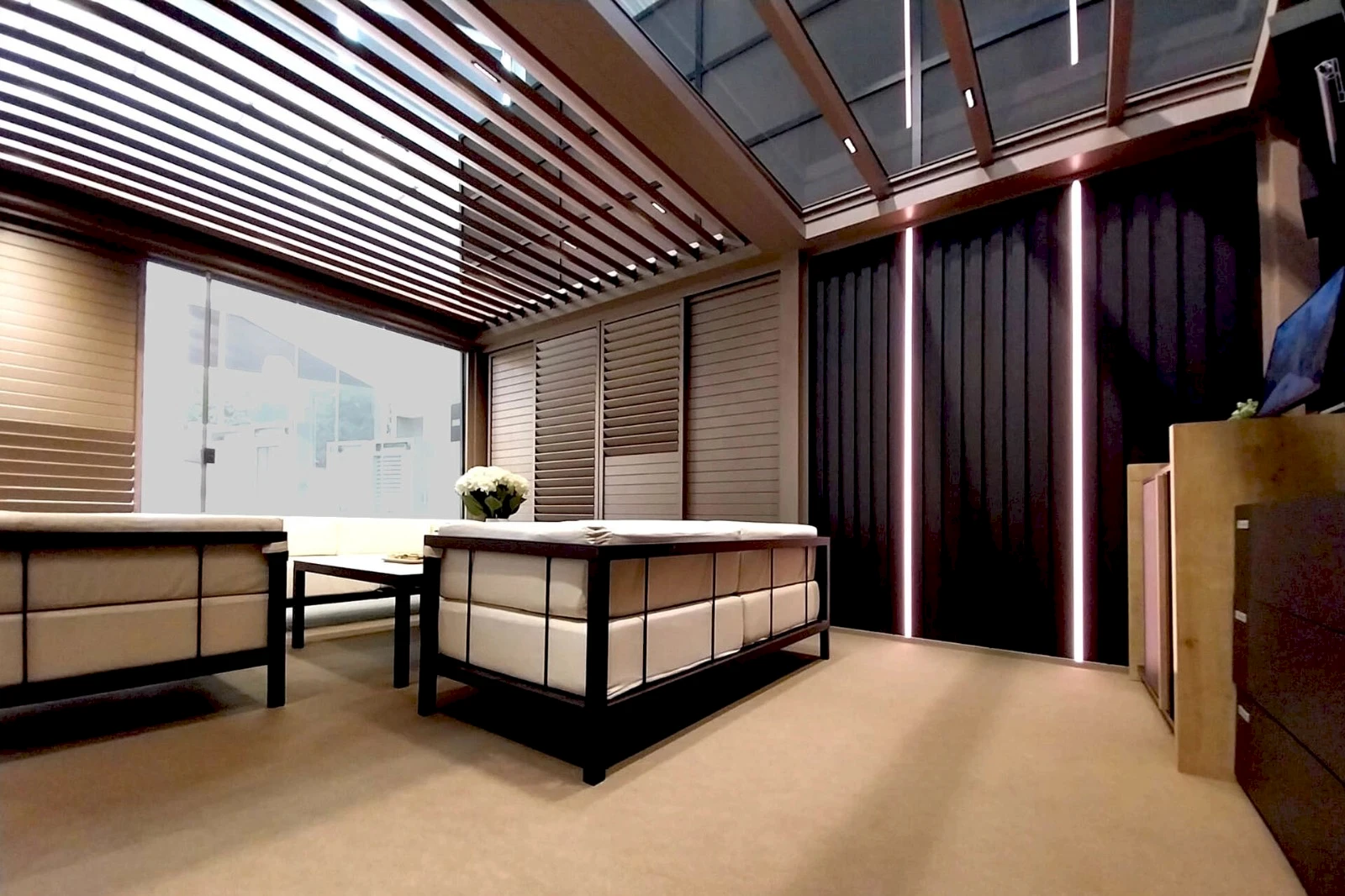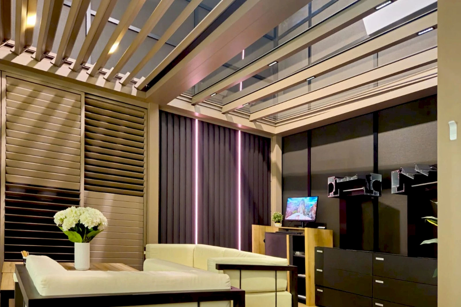 - Ak chcete chrániť seba, svoj nábytok a doplnky, oplatí sa zvoliť bočné rolety, panely Shutters posuvné, alebo fixné presklenie.